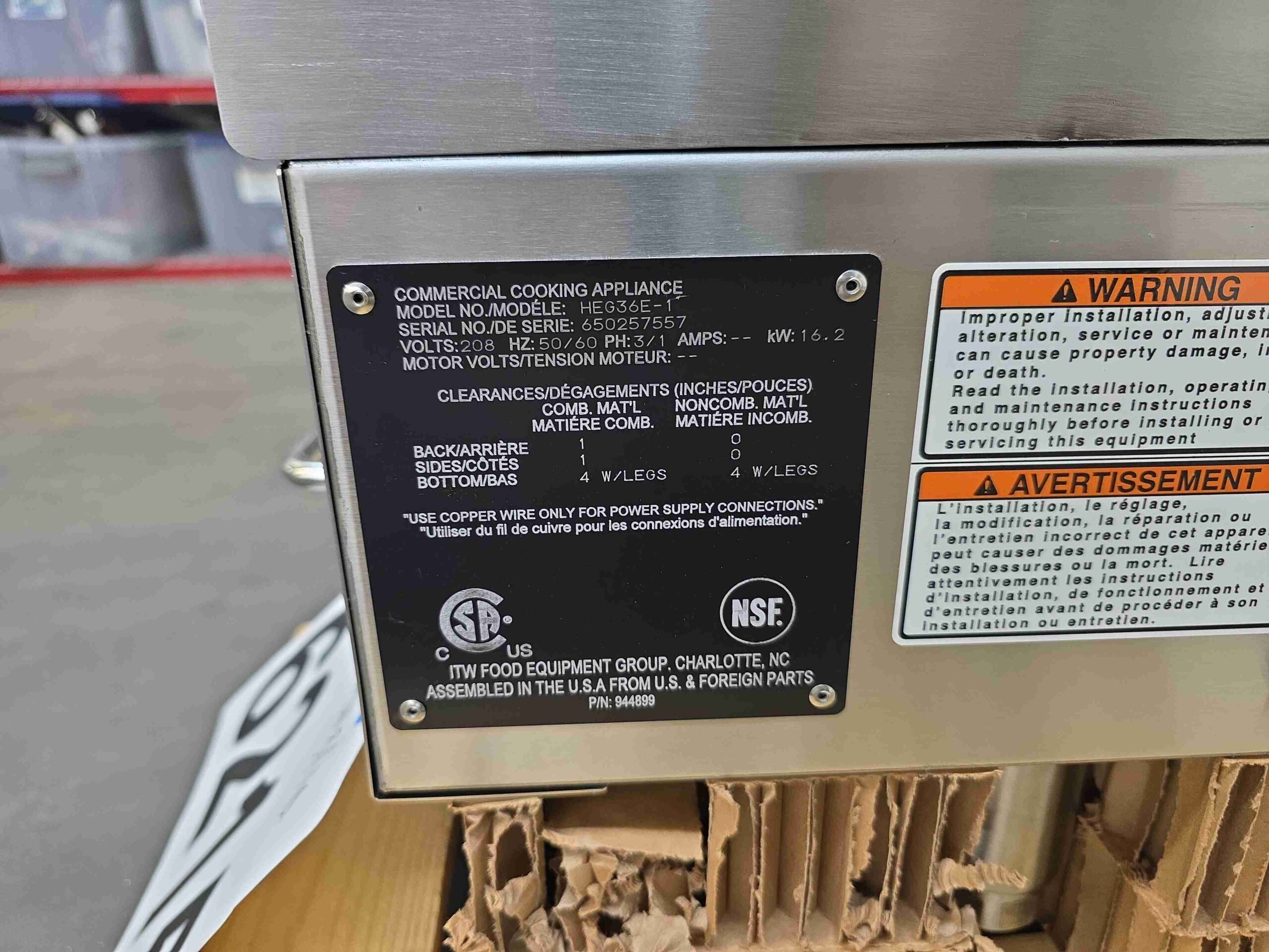 All Vulcan and Wolf equipment are purchased as-is-where-is and do not carry the factory warranty.  L&D Appliance does offer a 10-day warranty after the product has been installed.  The installation needs to be by a professional that can set-up and install the equipment properly.  Installation receipt and date will need to be provided for installed equipment for L&D Appliance to honor the 10-day warranty.  Parts will be provided by L&D Appliance along with your local tech support for repairs.